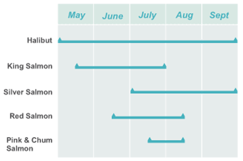 Halibut fishing is excellent in Cook Inlet (Deep Creek/Anchor Point/Homer) and Prince William Sound (Seward/Whittier) starting in May and continuing through the end of September. Every year halibut in excess of 200 lbs are caught in these waters.